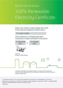 We asked the experts. The best bit of advice we have received is not to approach the problem half hearted and to make it a core business focus. We have employed an environmental consultant Richard Mounsey  who will work to evolve our business practices in order to cut down the carbon impact of FC Laser. We have already had some great early wins. Having signed up to have all of our energy provided by sustainable sources through British Gas. We are also well on our way to being ‘0’ to landfill with a target date of 2023 for complete 0!